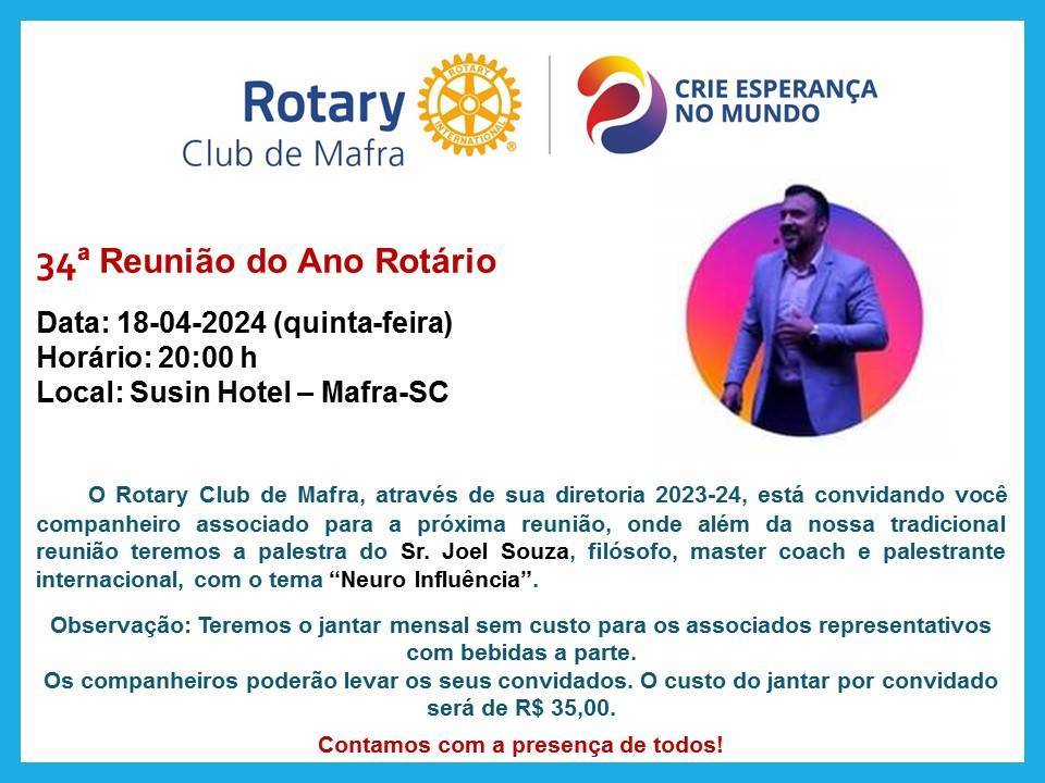 ACONTECEU NA DATA DE 18.04.2024, A 26ª REUNIAO ORDINÁRIA SENDO A MESMA A 34ª DO ANO ROTÁRIO, ONDE ALÉM DOS COMPANHEIROS SE FIZERAM PRESENTES OS PRESIDENTES DO RC DE CANOINHAS-SC, COMPANHEIRO IVAN KRAUSS E O COMPANHEIRO MAURO BARROS DO RC DE CAMPO DO TENENTE-PR, DISTRITO 4730. APÓS OS TRABALHOS ROTINEIROS FOI CONVIDADO O PALESTRANTE DA NOITE O SR. JOEL SOUSA QUE PROFERIU UMA PALESTRA MOTIVACIONAL CUJO TEMA FOI " NEURO INFLUÊNCIA". APOS SEGUIU-SE EM CLIMA DE COMPANHEIRISMO E SERVIDO O JANTAR.