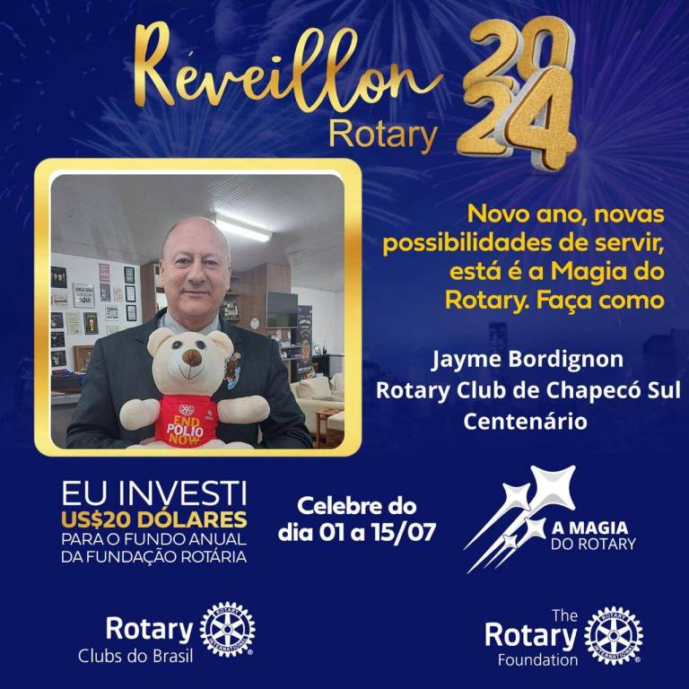 Em Assembleia no dia 06/07/2024 foi lançado a campanha Mascote da Pólio que ganhou o nome Polinho, e nossos companheiros do Rotary Clube de Chapecó Sul Centenário aderiram a campanha colaborando com a compra do mascote. "Assim sempre continuamos ajudando para a vacinação de nossos pequenos com gotinhas que salvam vidas", diz Noeli Bordignon, companheira do clube. A campanha do Distrito segue e a contribuição do clube na divulgação também.